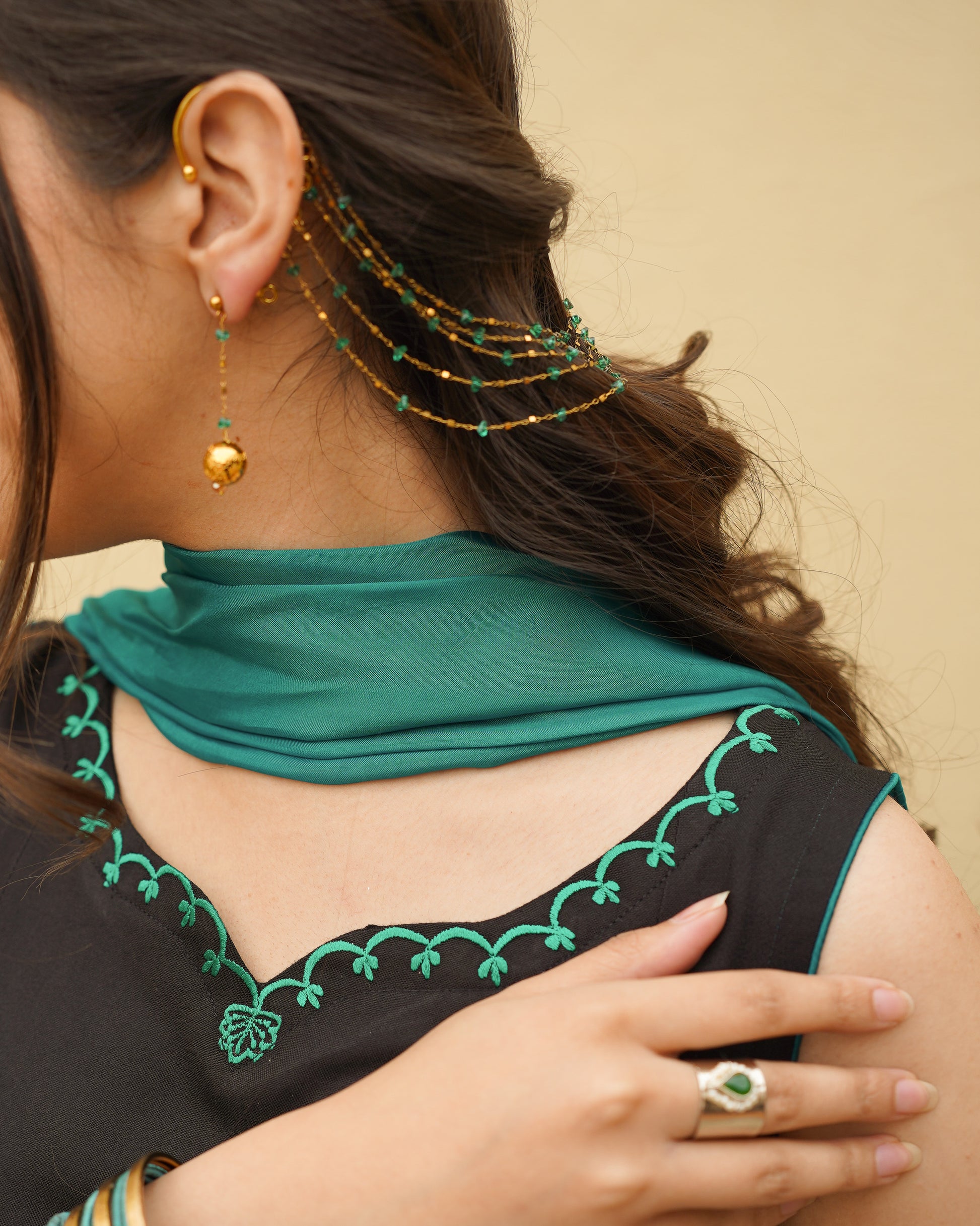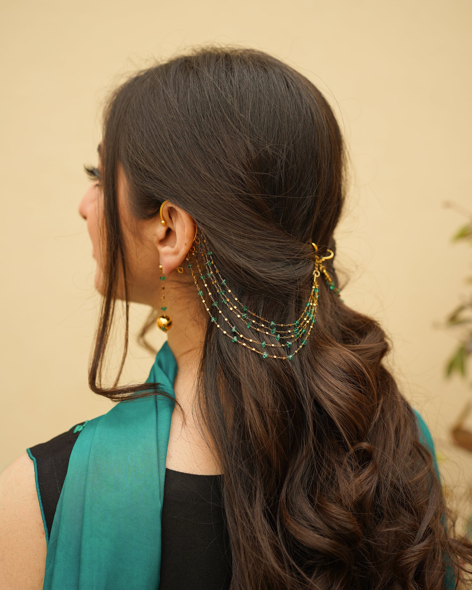 The daintiest teal & gold beaded Saharas on a stainless steel chain with 6 tier layering. Comes with a hook that can easily be secured in any hairstyle. Ear cuff sits comfortably on the ear.