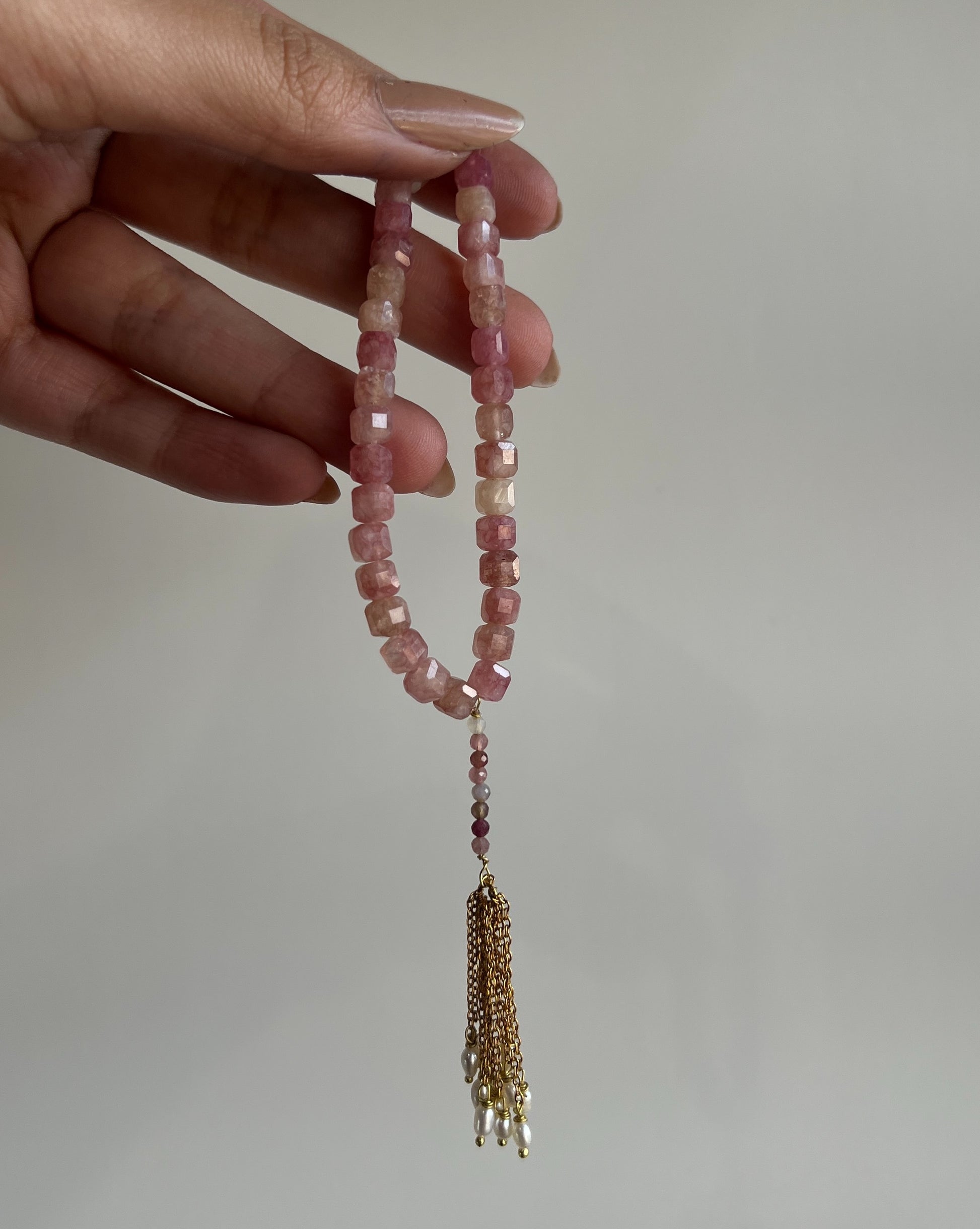Each stone is hand loomed on tilla thread finished with a stainless steel tassel with original freshwater pearls making it a unique, timeless tasbeeh that can serve as an heirloom! Available in three colors.